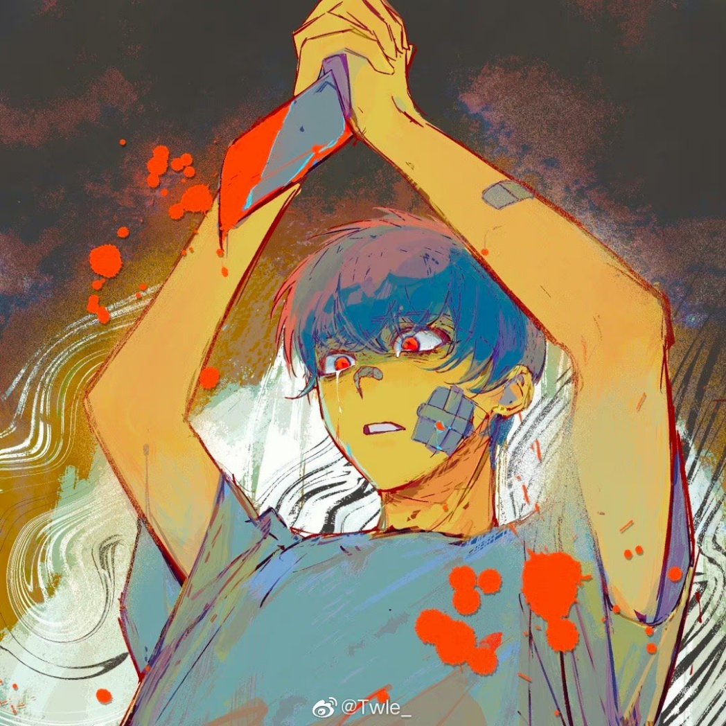 1boybags under eyesblack hairbloodblood splatterbloody weaponblue shirtcryingcrying with eyes openholdingholding knifeincoming attackknifepovred eyesshirtshort hairsolot-shirttearstwleupper bodyweapon