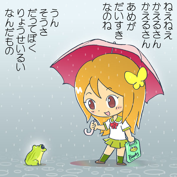1girlblushbrown hairchibifemale focusfroggradient backgroundlong hairrainschool uniformserafukusoloumbrella