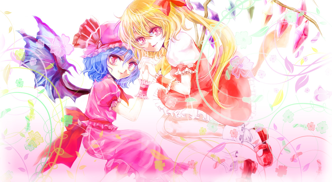 2girlsbat wingsblonde hairblue hairfemale focushatholding handsmultiple girlsone side upponytailred eyesshort hairsiblingsside ponytailsisterswings