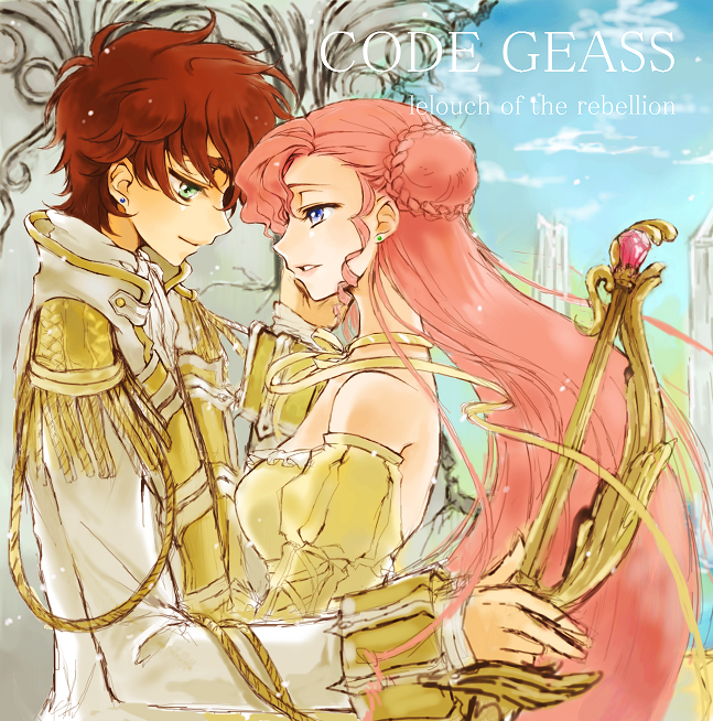 00s1boy1girlbare shouldersblue eyesbrown haircoupledetached sleevesdonut hair bundressearringsepaulettesformal clothesgemgreen eyesgreen hairhair bunheterojewelrylight smilelong hairpink hairshort hairswordweapon