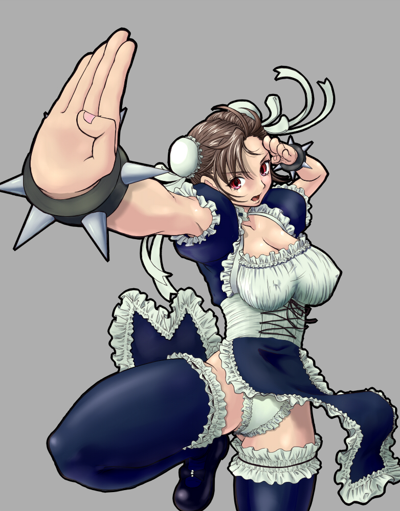 1girlalternate costumebraceletbreastsbrown hairbun covercleavagecovered erect nipplesdouble bunenmaidedfemale focusforeshorteningfrillshair bunjewelrylarge breastsmaidpantiespelvic curtainred eyesshort hairsolospiked braceletspikesthighhighstoo manyunderwearwhite panties