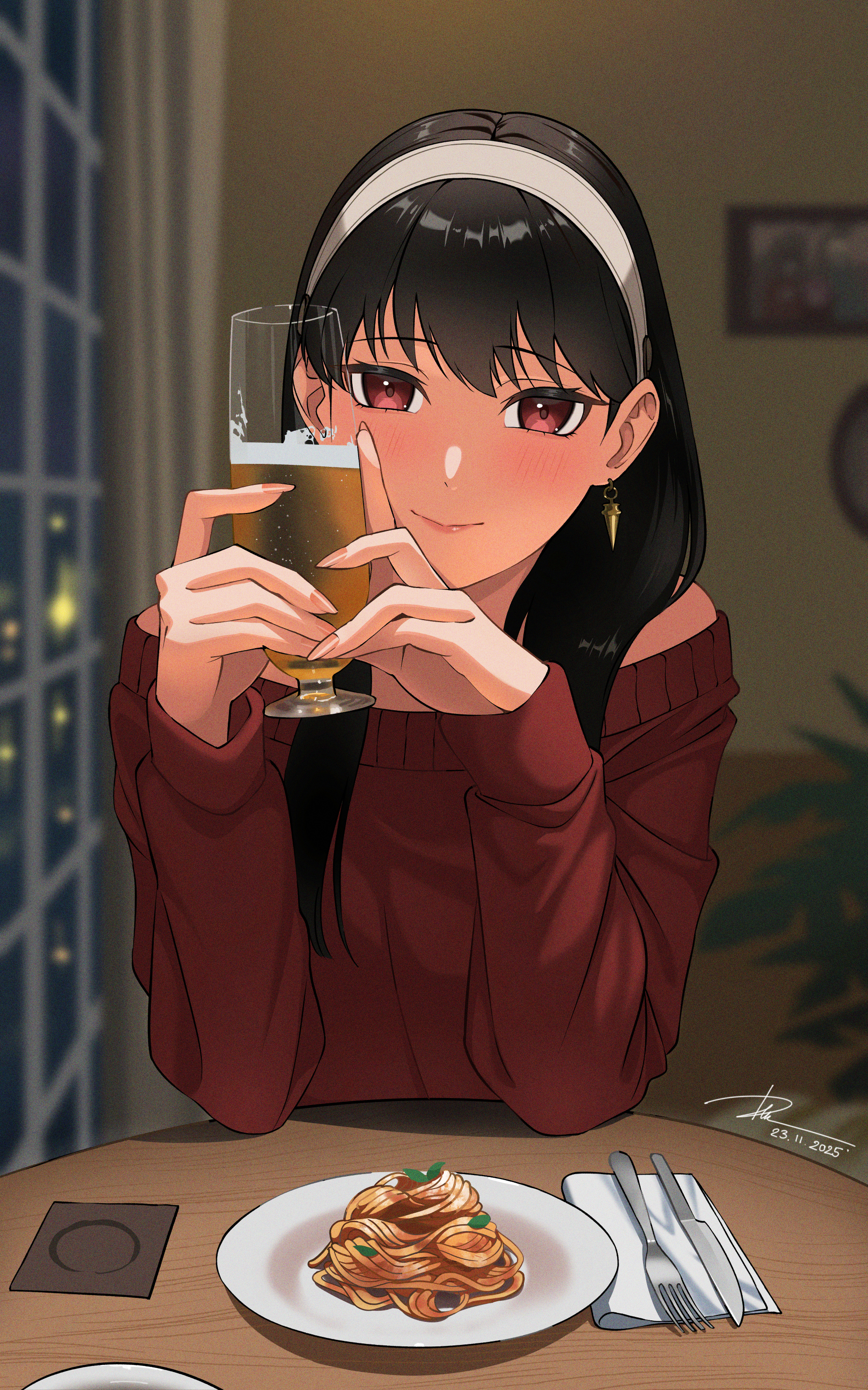 1girlalcoholbeerblack hairbreastsclosed mouthcupcurtainsdatedfoodhairbandholdingholding cupindoorsknifelong hairlong sleeveslooking at viewernightpastaplateportrait (object)red eyesred sweatersignaturesmilesolospaghettispoonsweaterwhite hairbandwindow