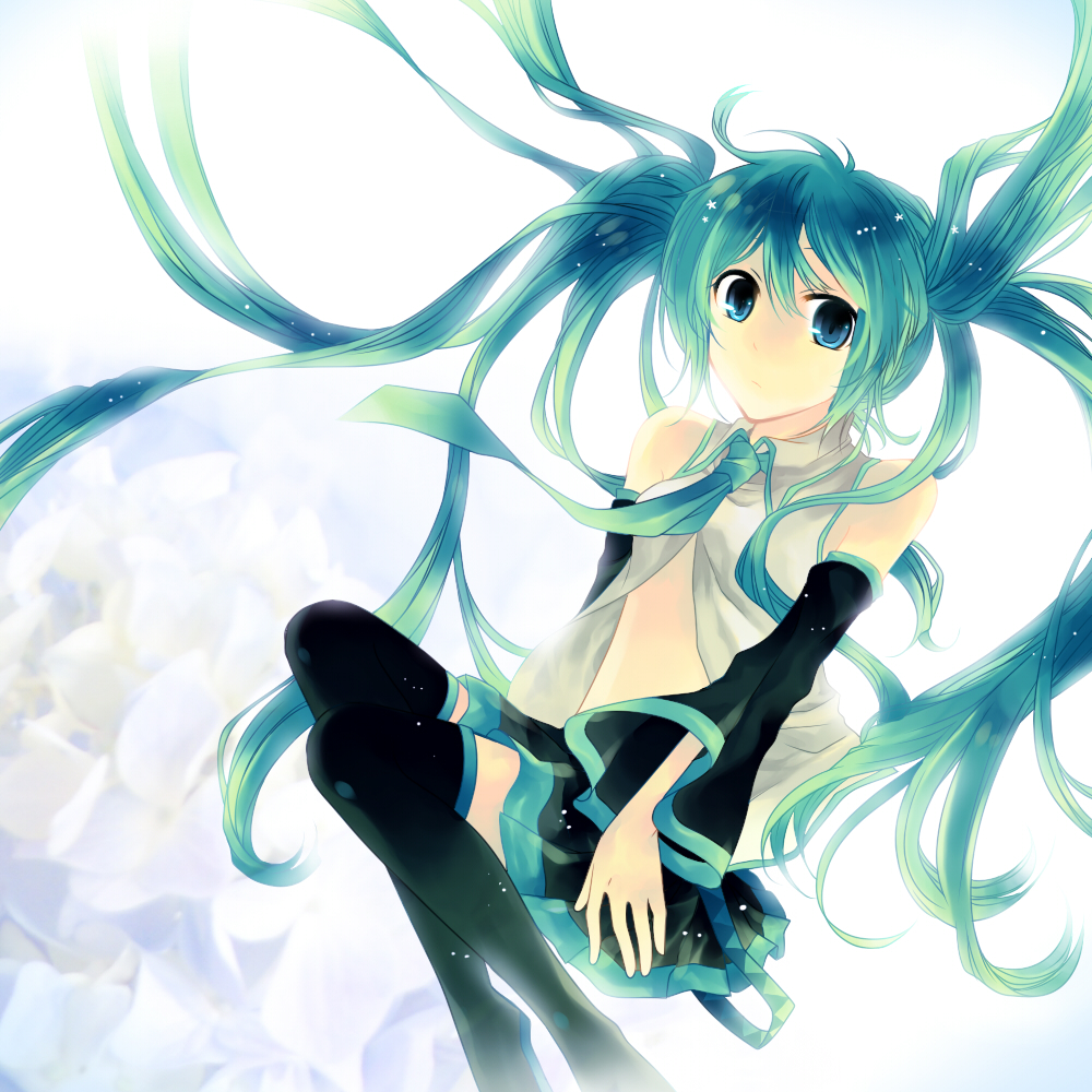 1girlaqua eyesaqua hairdetached sleevesfemale focuslong hairnecktieskirtsolothighhighstwintailsvery long hairzettai ryouiki