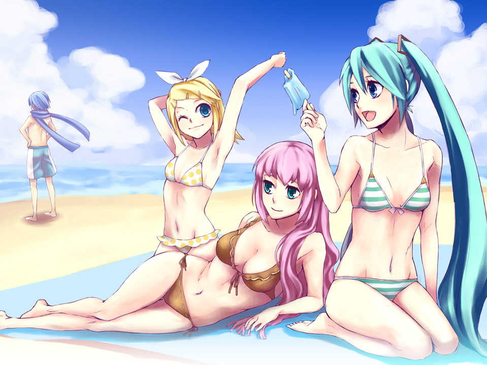 1boy3girlsaqua eyesarmpitsbarefootbeachbikiniblonde hairblue eyesbreastsbrown bikinicleavagedayfoodgreen hairlong hairlyingmultiple girlson sideone eye closedoutdoorspink hairpolka dotpolka dot bikinipolka dot swimsuitpopsicleshort hairside-tie bikini bottomsittingstretchingstriped bikinistriped clothesswimsuittwintailswink