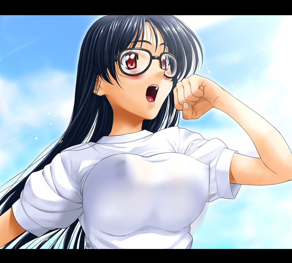 1girlbreastscovered erect nipplesfemale focusglassesimpossible clothesimpossible shirtlarge breastsletterboxedlong hairshirtsolosweat