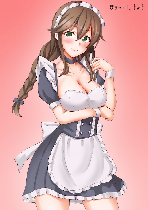 1girlalternate costumeapronblack dressblushbraidbreastsbrown haircleavagecorsetdressenmaidedfrilled apronfrillsgradient backgroundgreen eyeslarge breastslong hairlooking at viewermaidmaid apronmaid headdresspink backgroundpuffy short sleevespuffy sleevesshort sleevessmilesolotwin braidstwitter usernamewaist apronwhite apronwrist cuffs