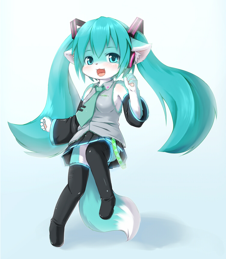 1girlanimal earsaqua eyesaqua hairblue backgroundblushbootsbreastscollared shirtdetached sleevesearphonesfangsfemale focusfox earsfox tailfull bodyfurrificationfurryfurry femalehair ornamentlong hairlooking at viewernecktieopen mouthshadowshirtsidelockssimple backgroundskirtsmall breastssmilesolotailtwintails