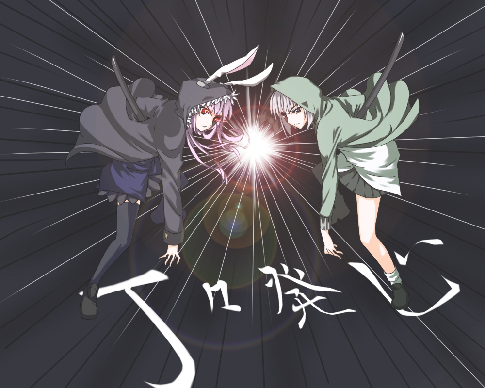 2girlsalternate costumefemale focusglowingglowing eyesgreen shirthoodhooded jackethoodiejacketmultiple girlspink hairred eyesshirtsweaterthighhighswhite hair