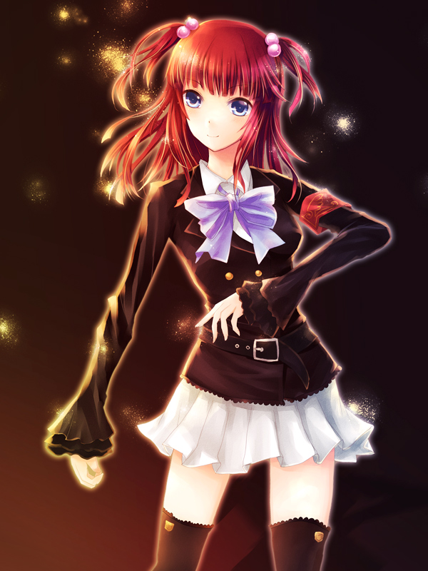 00s1girlarmbandbeltblue eyesfemale focusgradient backgroundhair bobbleshair ornamentred hairschool uniformskirtsolothighhighszettai ryouiki