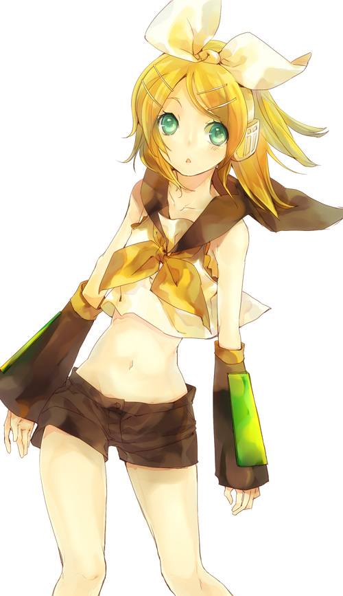:o1girlblonde hairblushcrop topfemale focusgreen eyeshair ribbonmidriffribbonshortssimple backgroundsolo