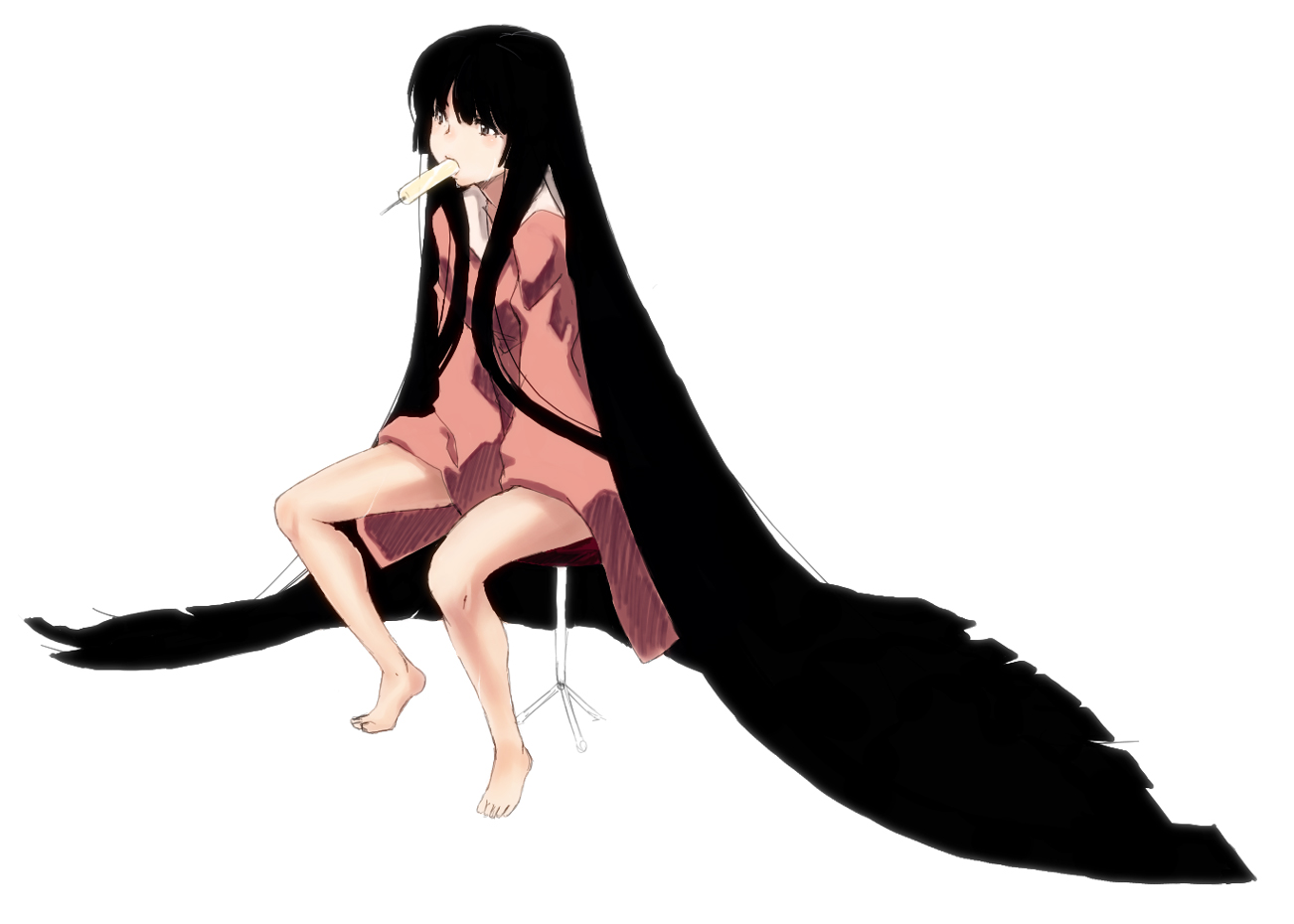 1girlbarefootblack hairblunt bangsblushfeetfemale focusfoodfull bodyhime cutlegslong hairpopsiclesimple backgroundsittingsolovery long hairwhite background