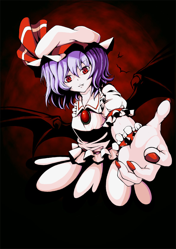 1girlbat (animal)bat wingsfangfemale focusforeshorteninggradient backgroundhatmoonpurple hairred eyesred moonshort hairsolowings