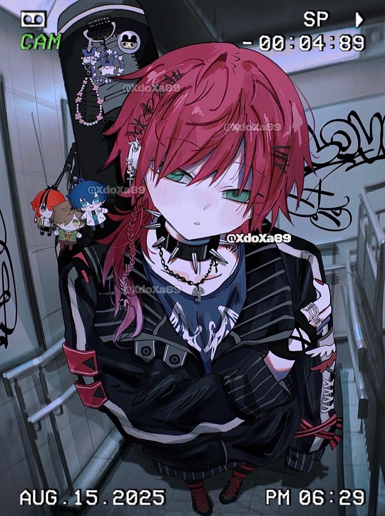 1boyalternate costumeartist nameblack glovesblack jacketcharm (object)chokerdatedear piercingfingerless glovesforeshorteningfull bodyglovesgraffitigreen eyeshair between eyeshair ornamenthaircliphand on own arminstrument caseinstrument case on backjacketjewelrylong hairlong sleeveslooking at viewermale focusmultiple ringsnecktieparted lipspiercingponytailpunkred hairringside ponytailsolospiked chokerspikesvirtual youtuber