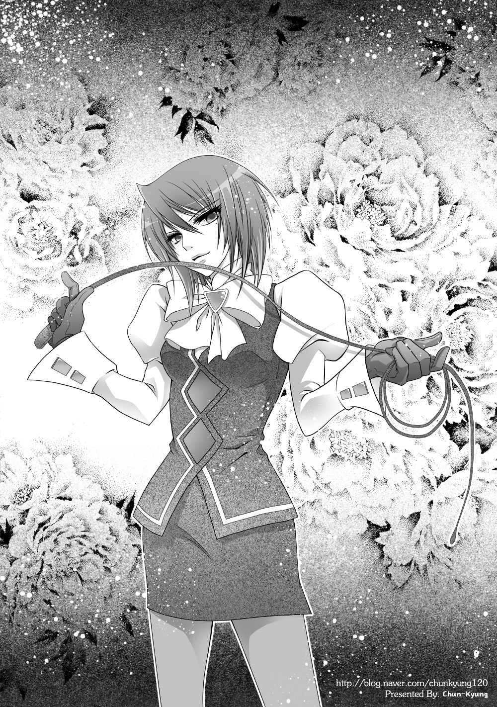 1girlascotfemale focusflowerformal clothesglovesgreyscalemolemole under eyemonochromepantyhosepencil skirtroseskirtsolosuitwhip