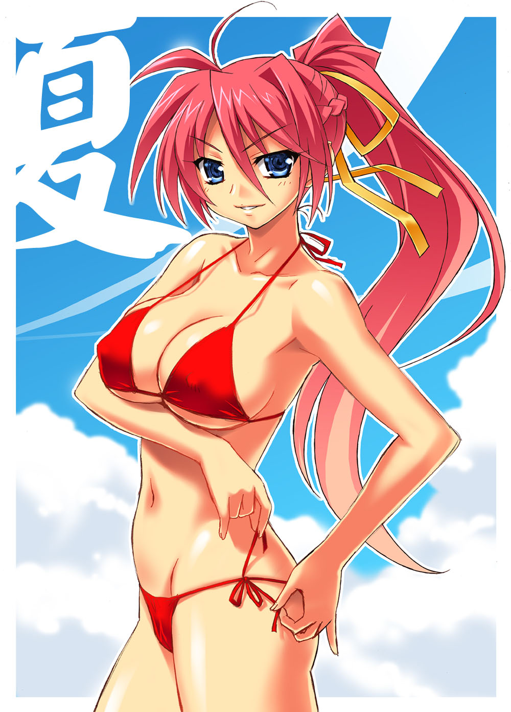 00s1girlbikiniblue eyesblushbreastsdayfemale focuslarge breastslong hairpink hairponytailred bikiniside-tie bikini bottomsmilesoloswimsuitundressing