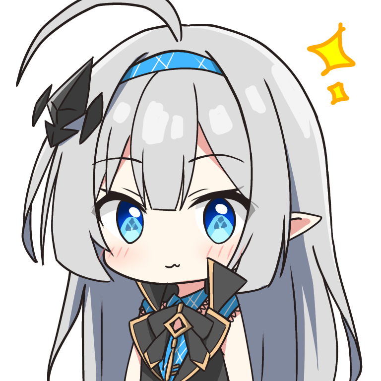 1girlahogeblack bowblack bowtieblack shirtblue eyesblue hairbandblushbowbowtiechibichibi onlyclosed mouthdouble-parted bangsgrey hairhair ornamenthairbandlong hairlooking at viewerpointy earsshirtsidelockssimple backgroundsleevelesssleeveless shirtsoloupper bodywhite background
