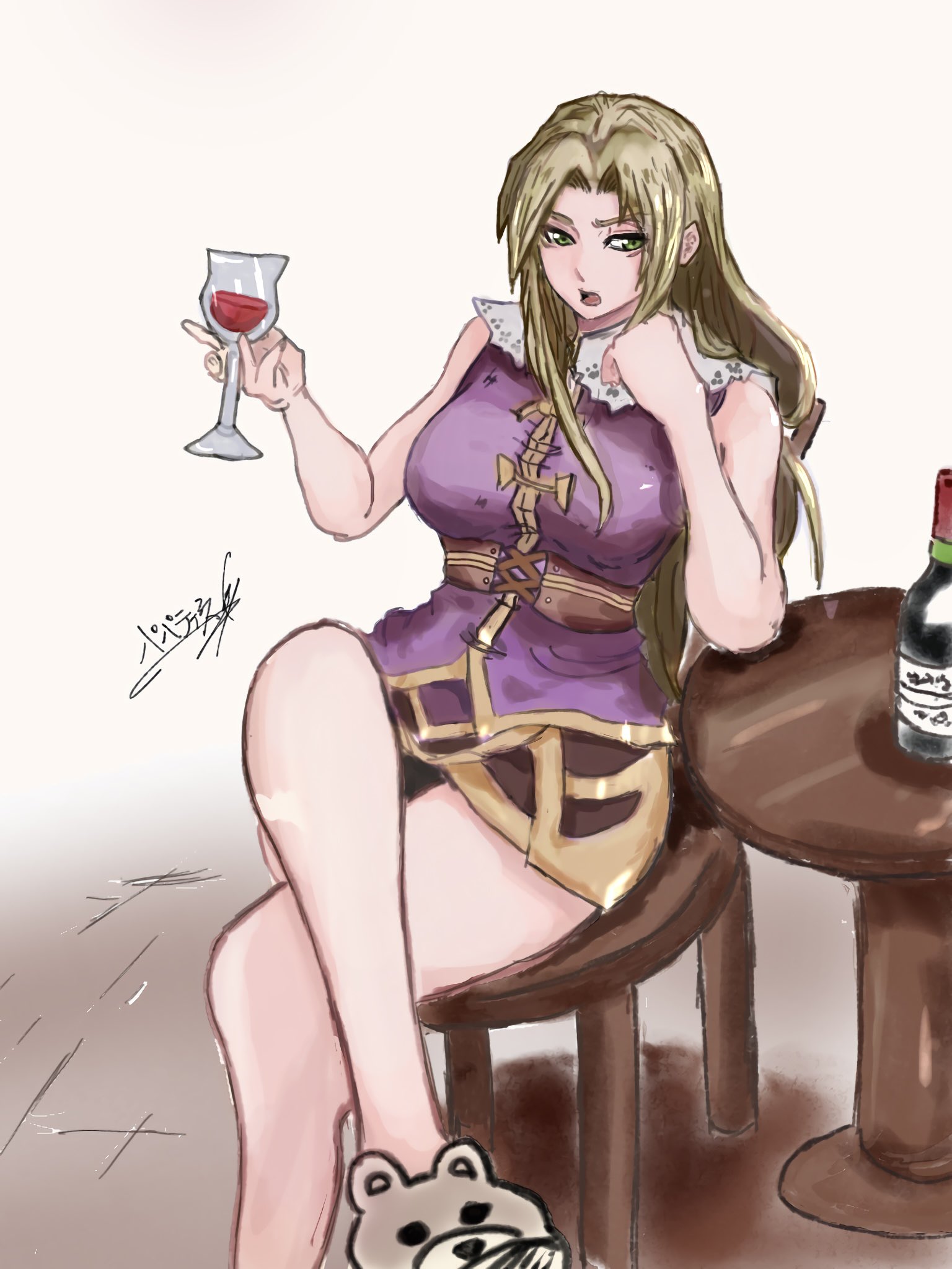 1girlalcoholblonde hairbottlebreastscupdrinking glasselbow on tablefoot out of framegreen eyeslong hairlooking at vieweropen mouthphoenix papatisred winesignaturesittingskirtslipperssolowinewine bottlewine glass