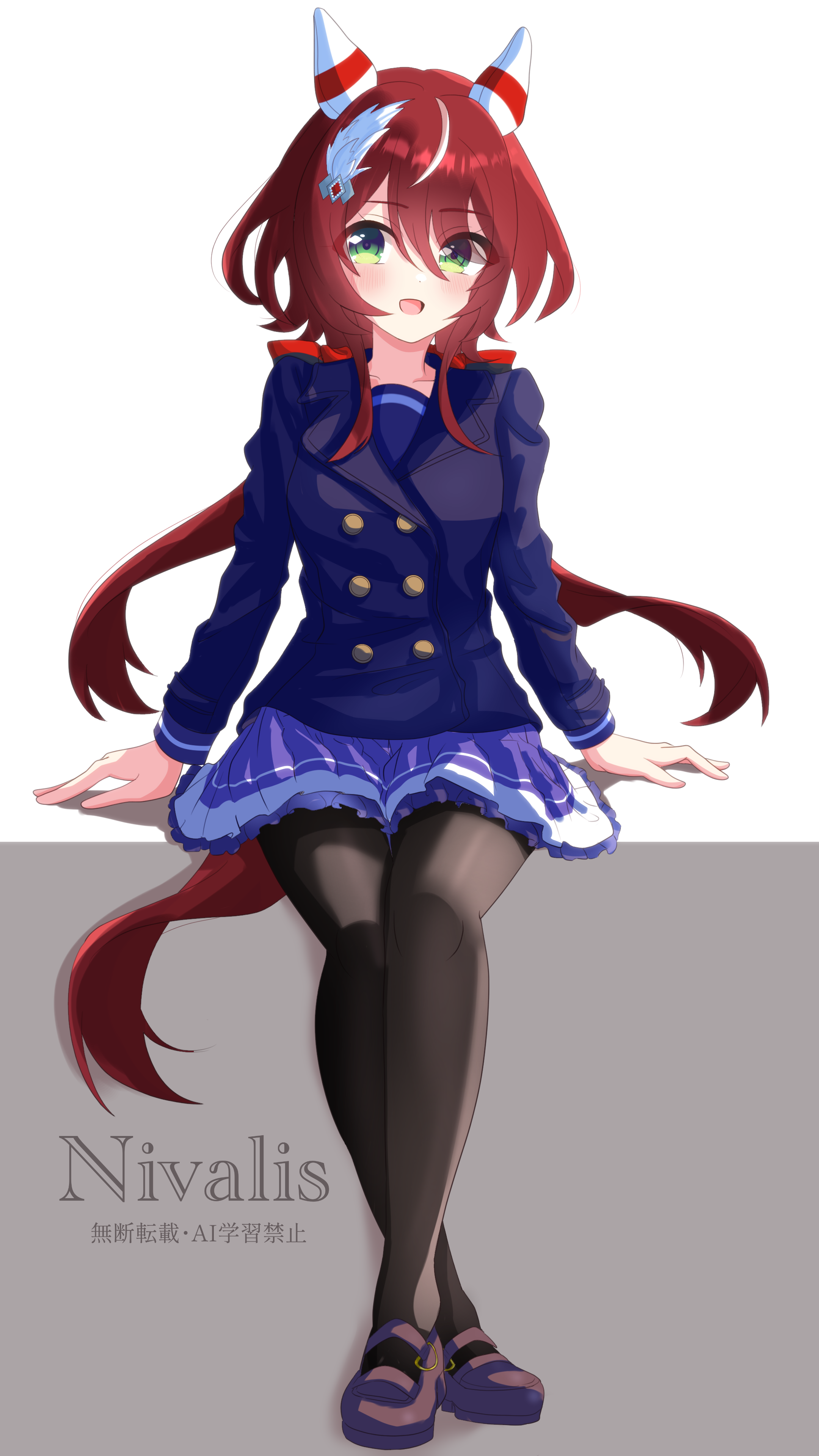 1girlanimal earsblack pantyhoseblue coatblushbreastsbuttonscoatdouble-breastedear coversear ornamentfeather hair ornamentfeathersgreen eyeshair between eyeshair ornamenthorse earshorse girlhorse taillong hairlooking at viewerlow twintailsopen mouthpantyhosepurple shirtpurple skirtred hairschool uniformshirtsittingskirtsmilesolotailtracen school uniformtracen winter coattwintailswinter clotheswinter coatwinter uniform