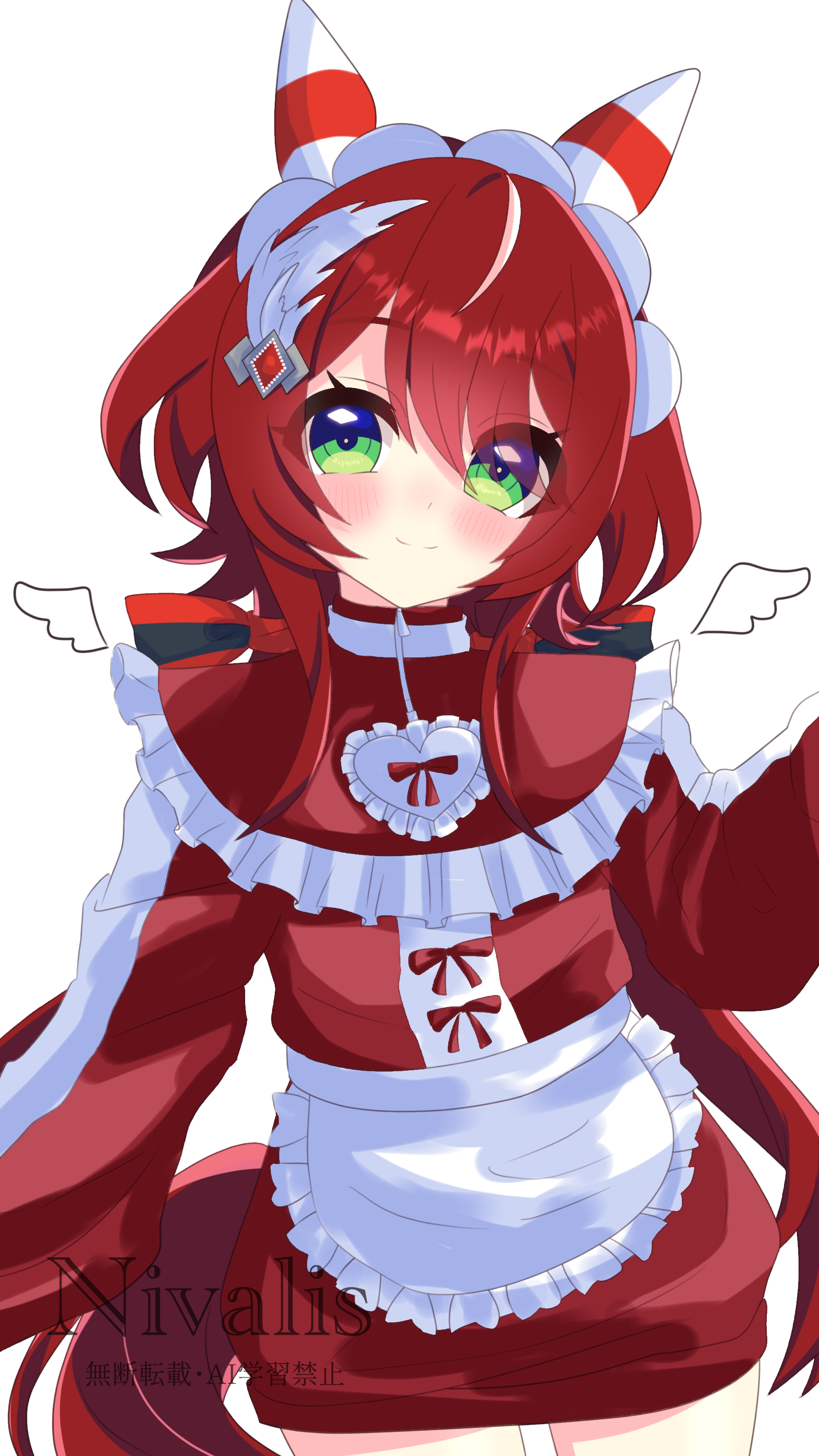 1girlanimal earsapronblushbowbreastsclosed mouthcrossdressingcrossdressing (mtf)ear coversear ornamentfeather hair ornamentfeathersfrilled apronfrillsgreen eyeshair between eyeshair ornamenthearthorse earshorse girlhorse tailjacketjersey maidlong hairlong sleeveslooking at viewerlow twintailsmaidmaid apronmaid headdressmale maidred bowred hairred jacketsimple backgroundsmilesolotailtrack jackettwintailsunconventional maidwhite apronwhite backgroundwhite headdresswings
