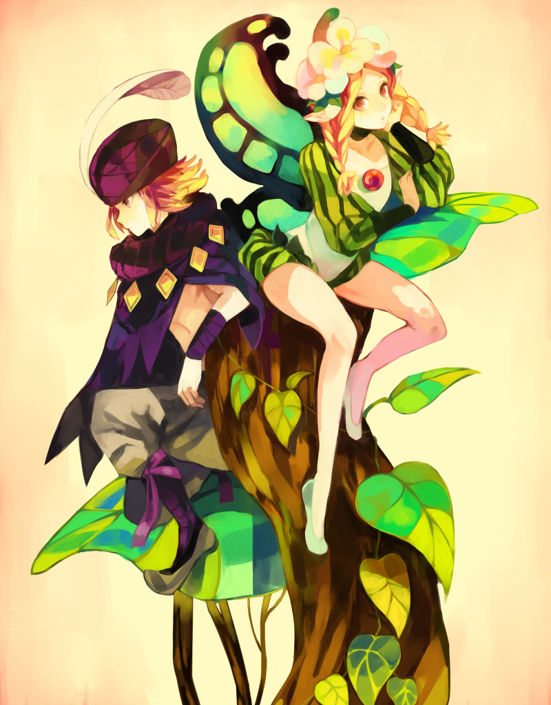 1boy1girlblonde hairbraidbutterfly wingscapefairyflowerhair flowerhair ornamentharem pantshathat featherhead wreathinsect wingspantsplantpointy earspuff and slash sleevespuffy shortspuffy sleevesshortstopless femaletreetwin braidsvineswings