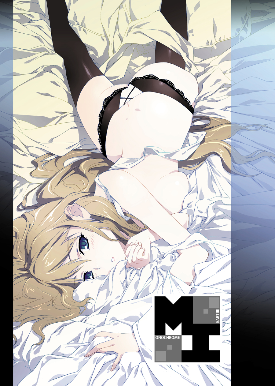 1girlbed sheetblack thighhighsblue eyesblushbrown hairfemale focuslong hairpantiessolothighhighstopless femaleunderwearunderwear only
