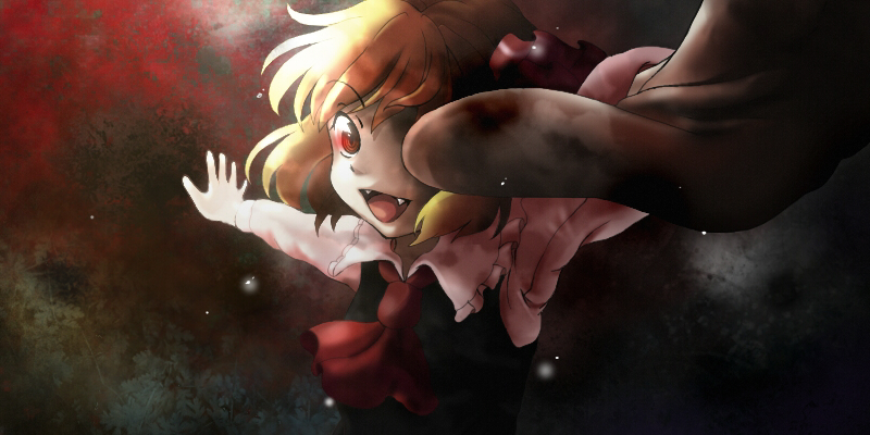1girlblonde hairfangsfemale focushair ribbonnecktieopen mouthoutstretched armsred eyesribbonshort hairsolospread arms
