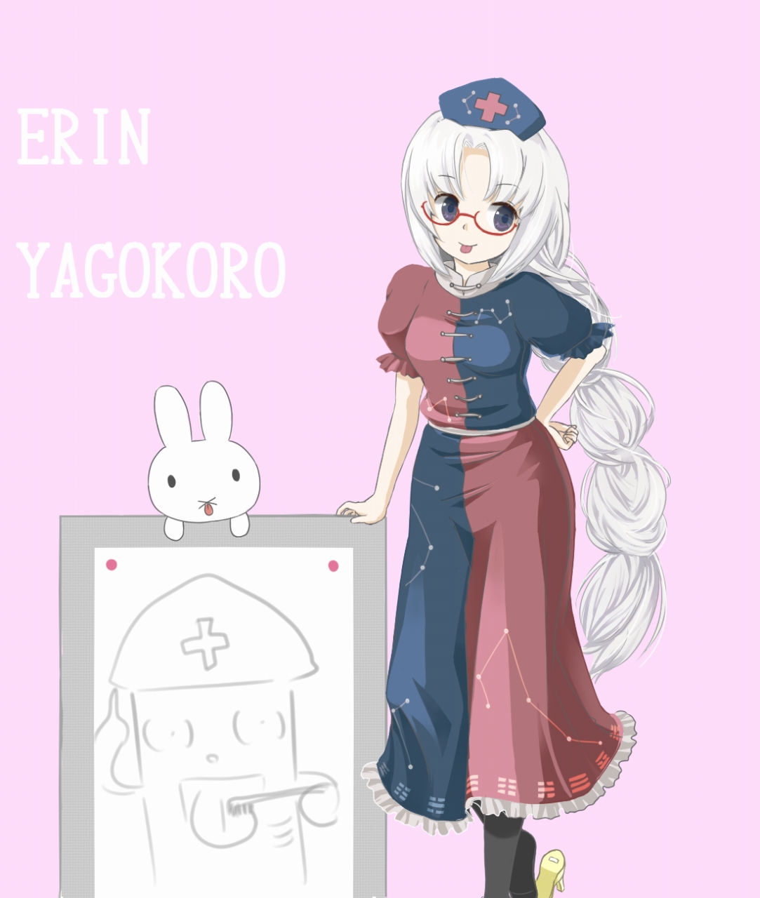 1girlbespectacledblue eyesbraidcharacter namecrossfemale focusglasseshand on own hiphathigh heelslong hairpantyhosepink backgroundpointingpointing uprabbitshort sleevessolotonguetongue outtoothbrushtrigramtypovery long hair