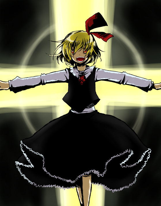 1girlblonde hairfemale focushair ribbonopen mouthoutstretched armsred eyesribbonshort hairsolospread arms