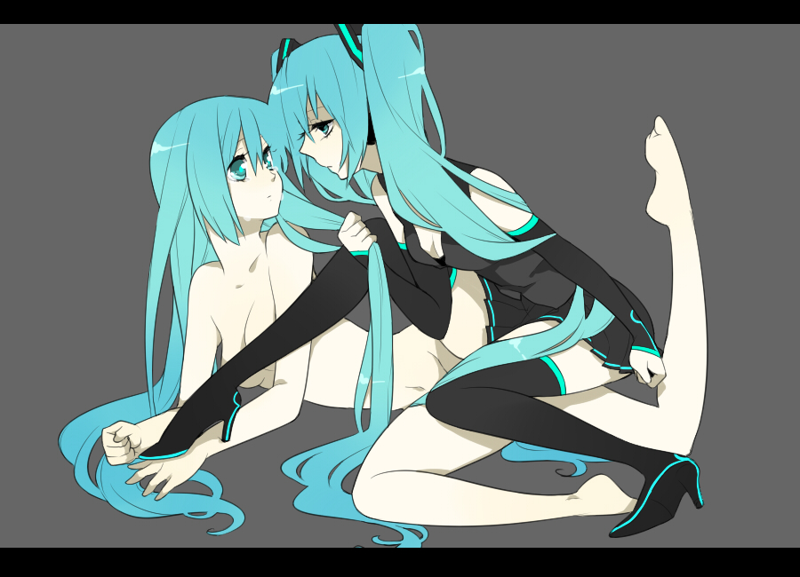 2girlsaqua eyesaqua hairblack thighhighsbreastscleavageclonedetached sleevesheadphoneslong hairmedium breastsmultiple girlsnudeskirtthighhighstwintailsvery long hairzettai ryouiki