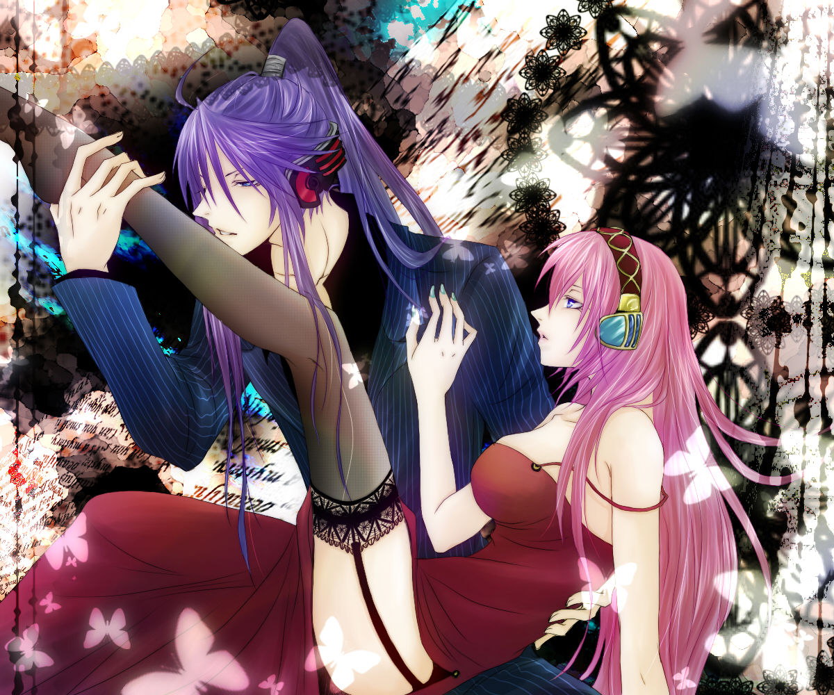 1boy1girlahogeaqua nailsblack thighhighsblue eyesdressgarter strapsheadphonesholdinglacelace trimlong hairnail polishpink hairponytailpurple hairthighhighs