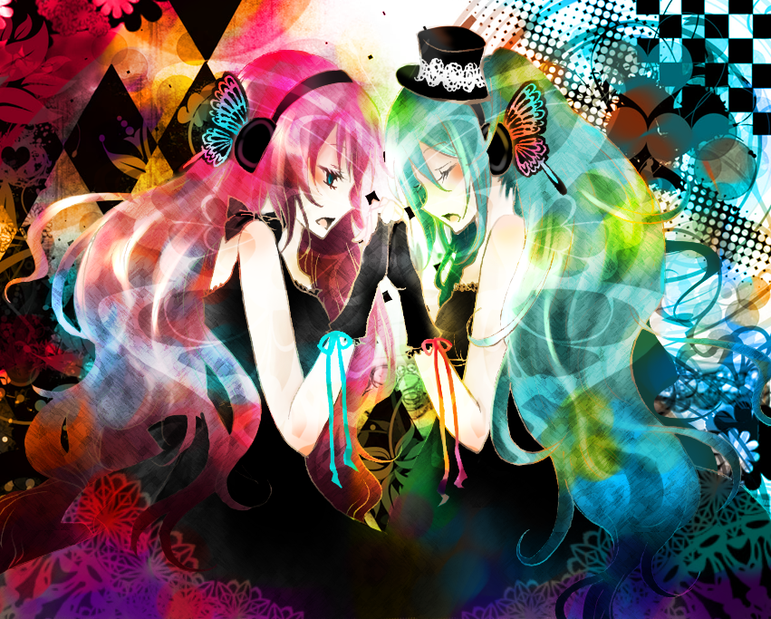 2girlsaqua eyesaqua hairbutterfly wingsdressfingerless glovesgloveshatheadphonesholding handsinsect wingslong hairmini hatmini top hatmultiple girlspink hairtop hatwingsyuri