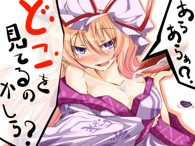 1girlalcoholblonde hairblushbreastscleavagedresseggplantfemale focusgradient backgroundhatjapanese clotheskimonolong hairpurple eyessakesoloupper body