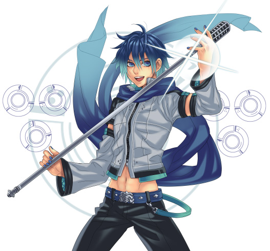 1boyabsbeltblue eyesblue hairblue scarfjacketmale focusmatching hair/eyesmicrophonemicrophone standmidriffnail polishscarfshort hairsmilesolo