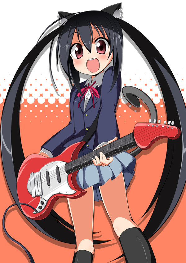 00s1girlanimal earsblack hairblack sockscat earscat girlcat tailfemale focusguitarhalftonehalftone backgroundinstrumentkneehighslong hairmustang (guitar)neck ribbonopen mouthred eyesred ribbonribbonschool uniformsmilesockssolotailtwintails