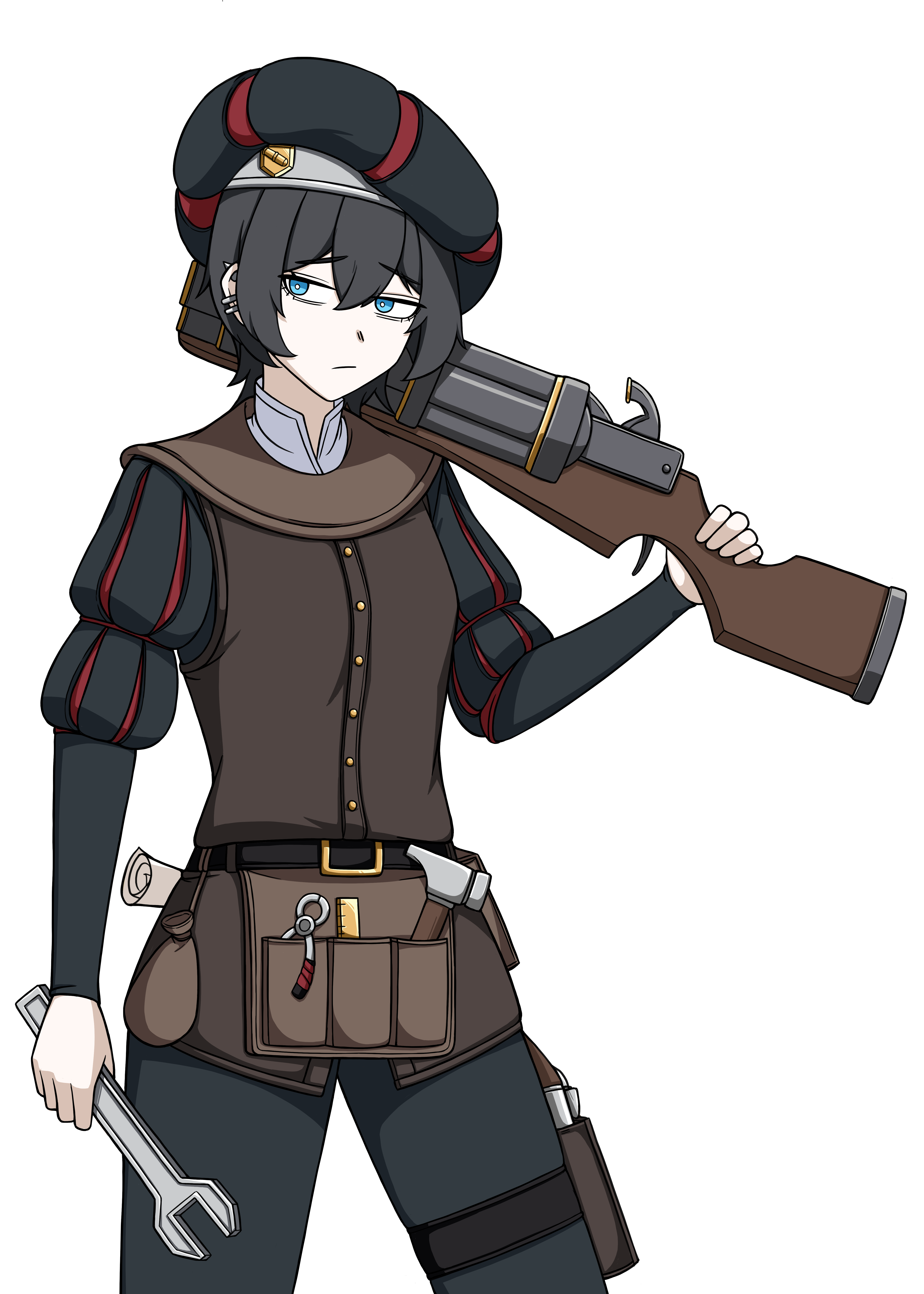 1girlantique firearmblack hairblack pantsblue eyesbrown haircometear piercingempire (warhammer fantasy)firearmfirelockflintlockgrey eyesgunhammerhatholdingholding wrenchholsterlandsknechtlong sleevesmp sgmulticolored hatpantspiercingshort hairsolothigh holstertomboytomboy nuln mercenary (mp sg)toolsweaponwhite backgroundwrench