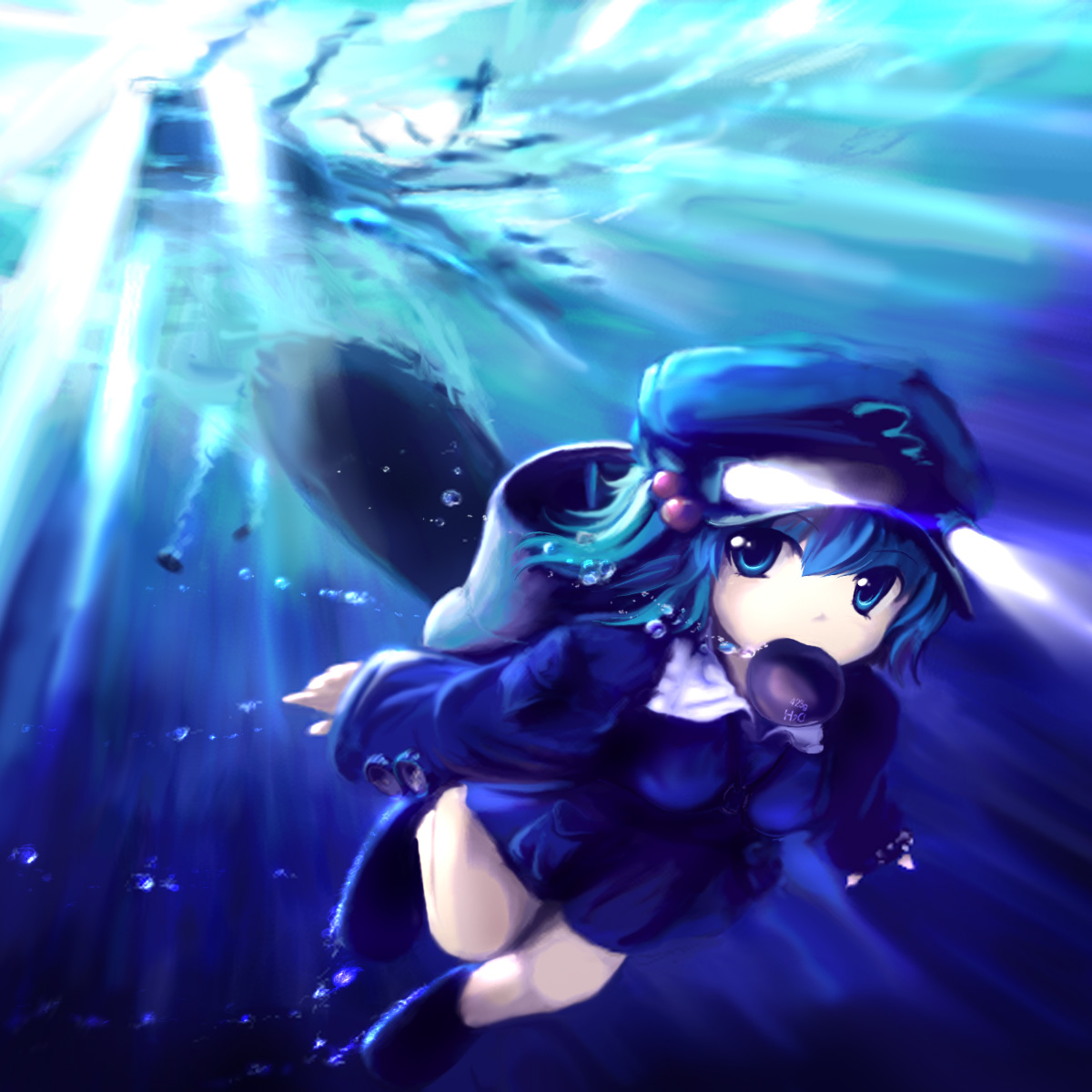 1girlblue eyesblue hairfemale focushair bobbleshair ornamenthatmatching hair/eyessoloswimmingtwo side upunderwaterwater