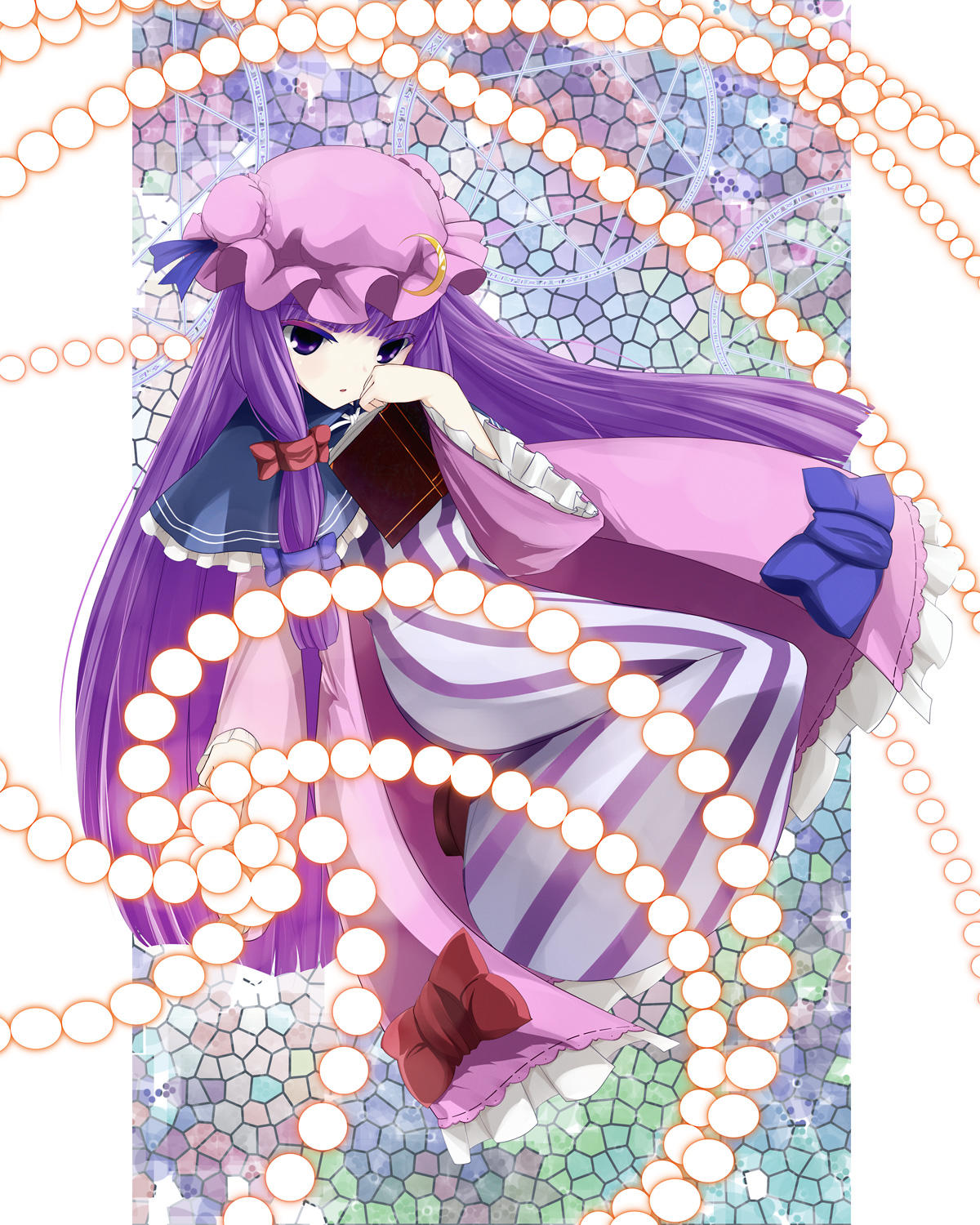 1girlbookcapeletcolored eyelashescrescentdanmakufemale focushatlong hairmosaic backgroundpale skinpurple eyespurple hairribbonrobesolovery long hair