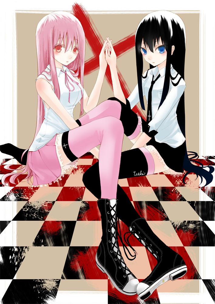 2girlsblack hairblue eyescheckered floorfloorlong hairmultiple girlsnecktieperspectivepink hairpink thighhighsred eyesribbonshirtshoesskirtsleevelesssleeveless shirtsneakerssymmetrical hand posethighhighszettai ryouiki