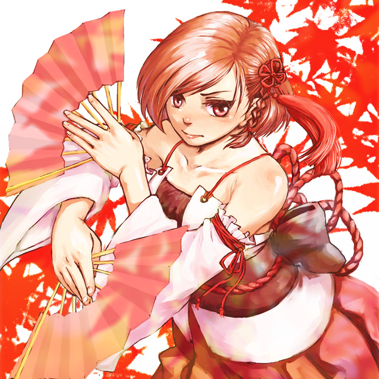 1girlbraidbrown eyesbrown hairdetached sleevesfemale focushair ribbonhand fanjapanese clothesribbonshort hairsolo