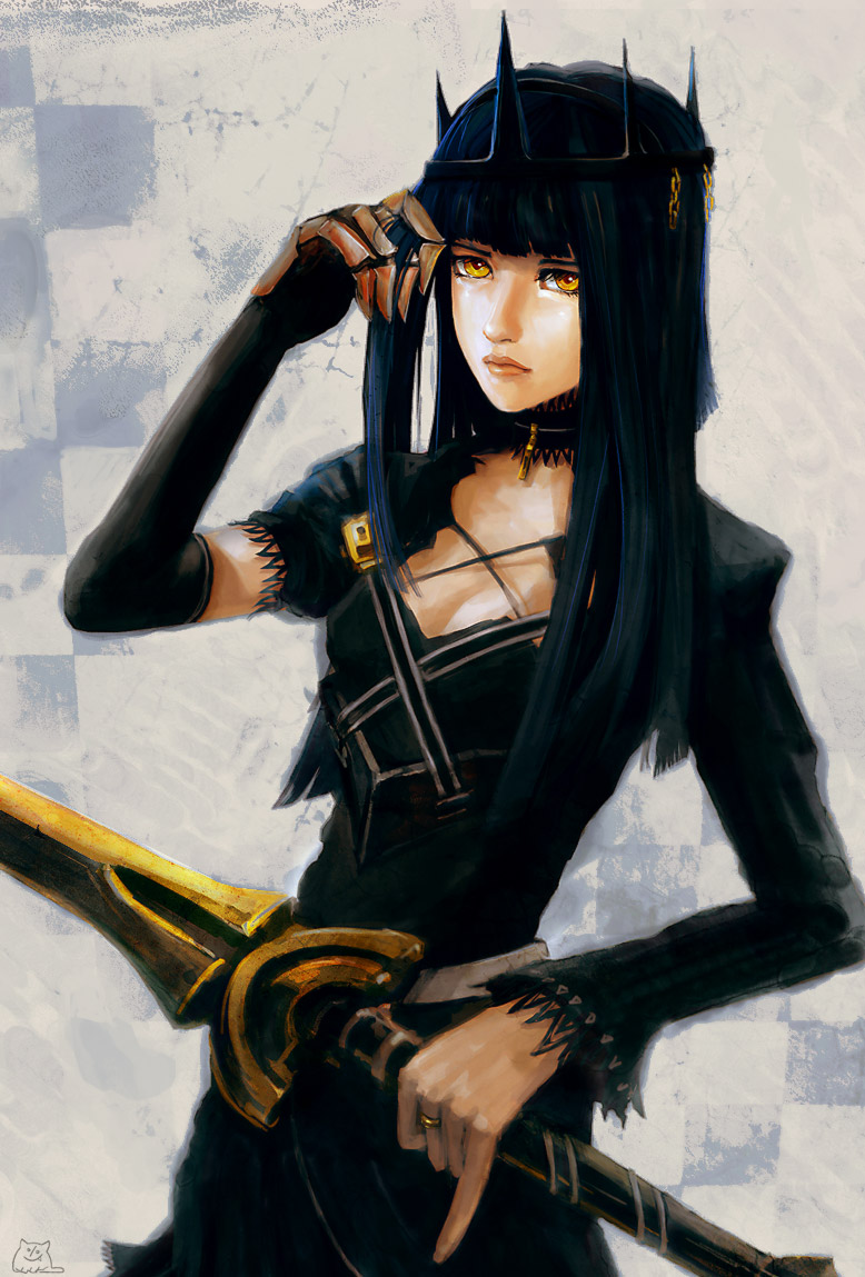 10s1girlblack hairblunt bangscrownfemale focusjewelrylipslong hairpinky outrealisticringsoloswordweaponyellow eyes