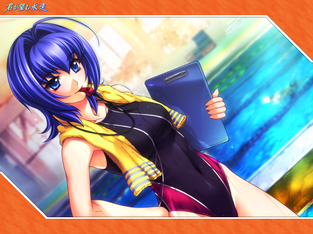 00s1girlblue eyesblue hairclipboardcompetition swimsuitdutch anglefemale focusmatching hair/eyesmouth holdone-piece swimsuitpoolpoolsideshort hairsmilesoloswimsuittowelwetwhistle