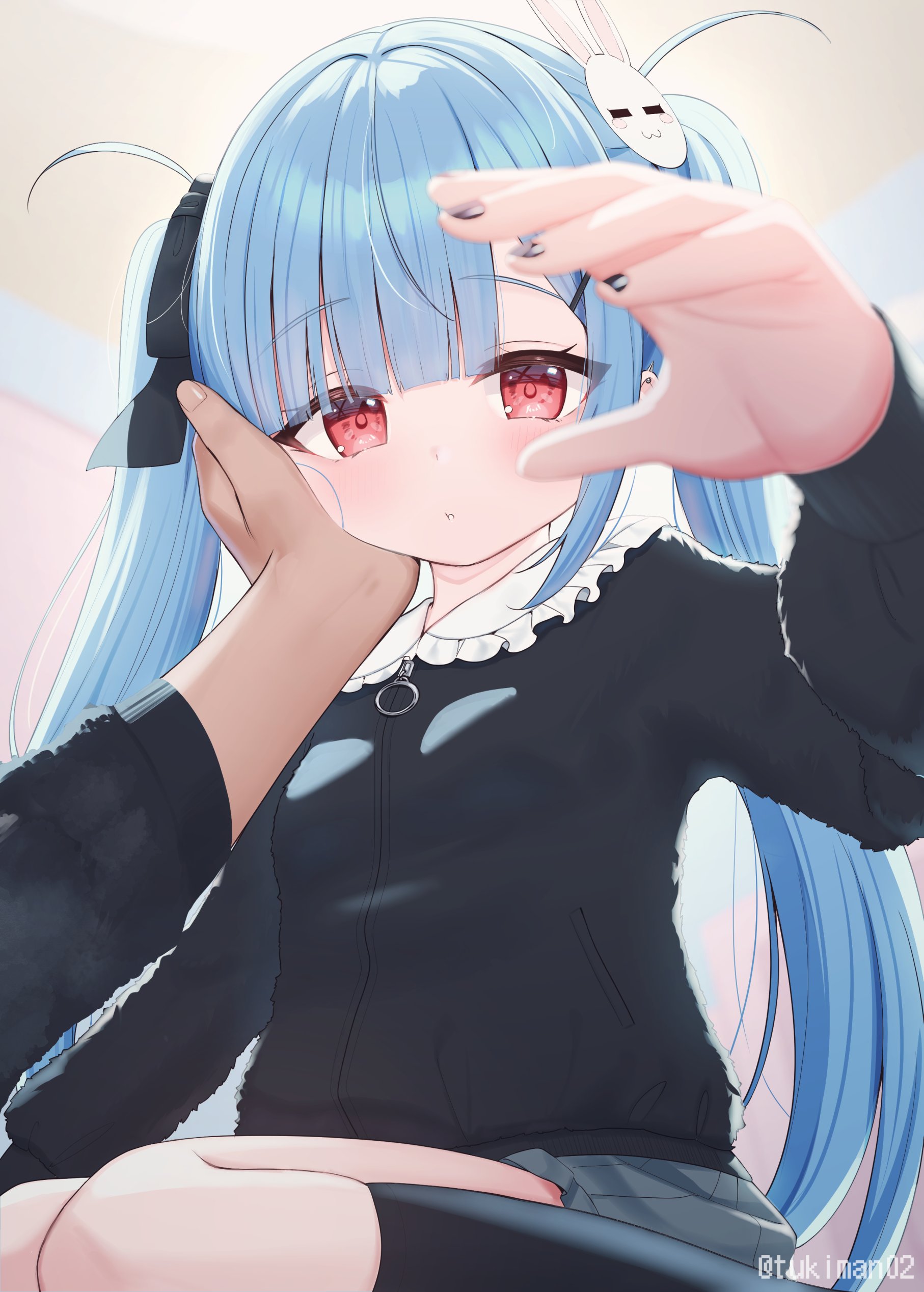 1girlblack bowblack nailsblack shirtblue hairbowbreastsfrilled shirt collarfrillshair bowhair ornamenthairclipkanae (tsukiman)long hairlong sleevespovpov handsrabbit hair ornamentred eyesshirtskirtsmall breastssockssolo focustwintailsvery long hair