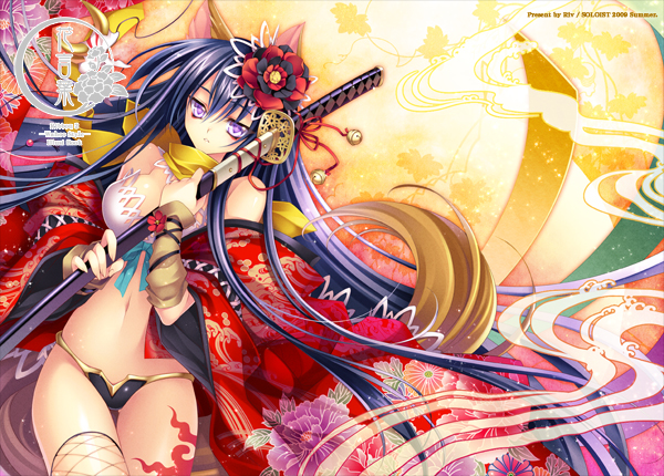 1girl2009animal earsblack hairfemale focusfox earsfox tailkatanalingerielong hairmidriffpurple eyessoloswordtailunderwearvery long hairweapon