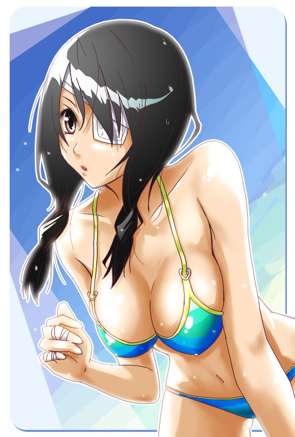 00s1girlbandagesbare shouldersbikiniblack hairblue bikinibraidbreastsbrown eyescleavageeyepatchfemale focuslarge breastslong hairnaveloutdoorsskysoloswimsuittwin braids
