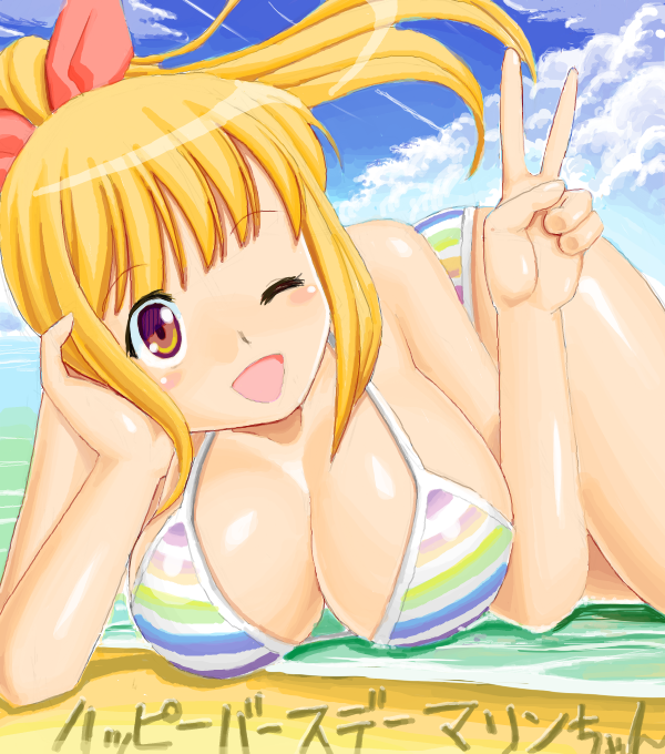 00s1girlbeachbikiniblonde hairblushbreastsbrown eyescleavagedayfemale focushair ribbonlarge breastsponytailribbonsolostriped bikinistriped clothesswimsuittwintailsv