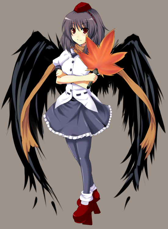 1girlblack hairblack wingscrossed armsfemale focusgetahand fanhatred eyesribbonscarfshort hairskirtsolotengu-getathighhighstokin hatwings