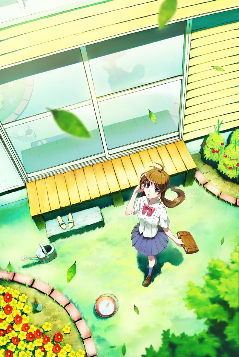 1girladjusting hairbackyardbagblue eyesblurrybrown eyesbrown hairbucketdepth of fieldfemale focusflowerfrom abovegardenleaflong hairnaturereflectionsatchelschool bagschool uniformskirtsolotucking hairtwintailswatercanwatering can