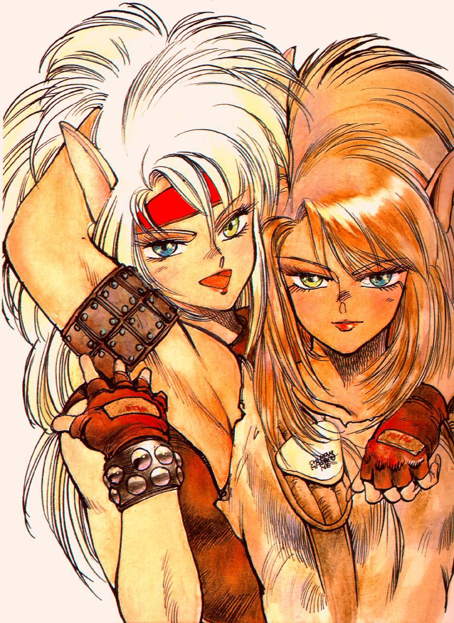 2girlsandroidanimal earsarmbandarmpitsbig hairblonde hairblue eyesbraceletcat earsfingerless glovesglovesgreen eyesheadbandheterochromiahughug from behindjewelrylipsticklong hairmakeupmultiple girlsorange hairsiblingssignaturesisterssmiletank toptwinswhite hairyellow eyes