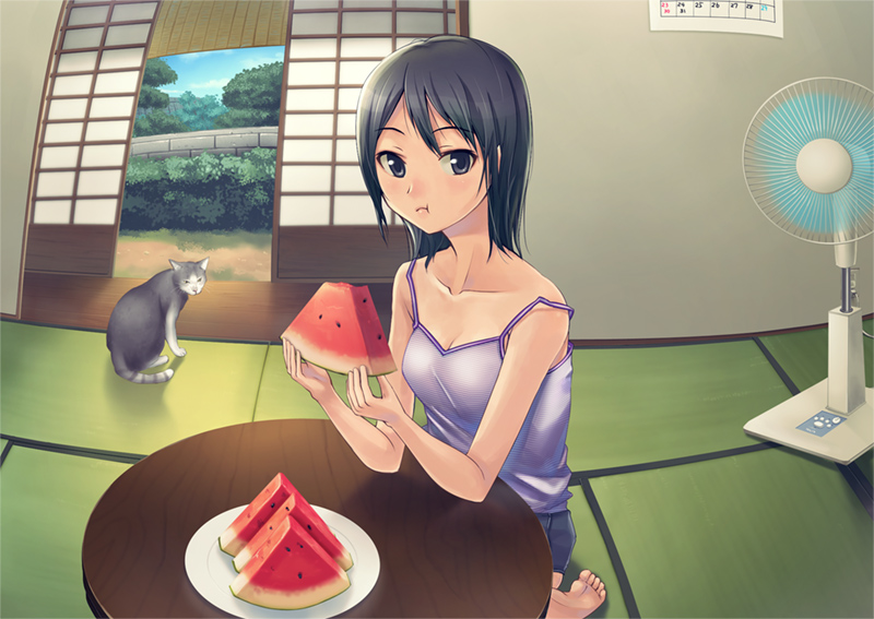 :t1girlbarefootblack eyesblack haircamisolecancateatingelectric fanfemale focusfisheyefoodfruitholdingholding foodholding fruitholding watermelonsittingsolotabletatamiwatermelon