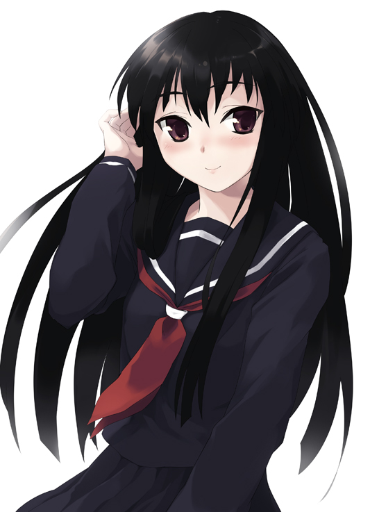 1girladjusting hairblack hairblack themebrown eyesfemale focuslong hairschool uniformserafukusimple backgroundsmilesolowhite background